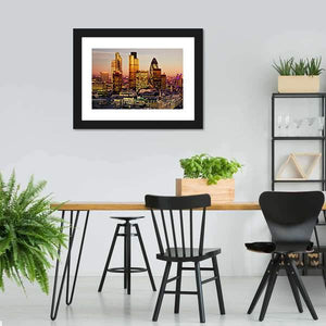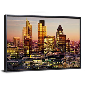 This canvas art captures a vibrant cityscape of London at sunset, showcasing the iconic skyscrapers and the distinctive Gherkin building. With a rich palette of orange, gold, blue, and grey, it brings an urban energy to any wall.