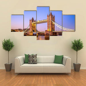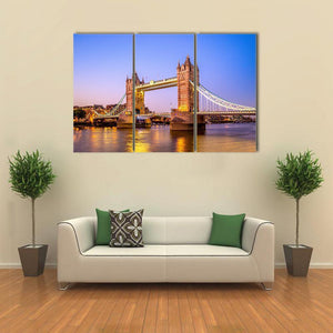 A photorealistic cityscape of London’s Tower Bridge at night, featuring the illuminated bridge and its reflection on the river. The symmetrical, wide-angle composition uses blue, yellow, beige and brown tones to create an iconic, picturesque, serene atmosphere. A quiet focal piece suited to modern wall decor and contemporary rooms.