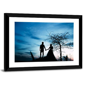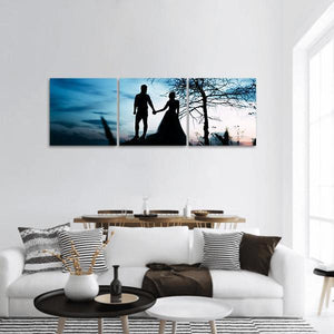 A romantic, serene panoramic canvas featuring the silhouetted couple—one in a wedding dress—holding hands beneath a lone tree. Rendered in blue, black, white, and gray with a rule-of-thirds composition, it brings a quiet, modern minimalist touch to bedrooms or living rooms.