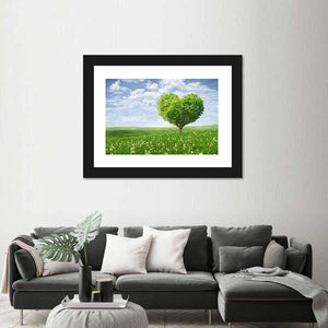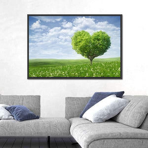 This canvas art features a heart-shaped tree surrounded by a beautiful flower field and gentle rolling hills beneath a cloudy sky. The serene and romantic scene brings a touch of nature's love into your space.