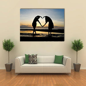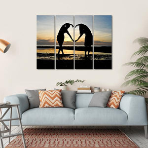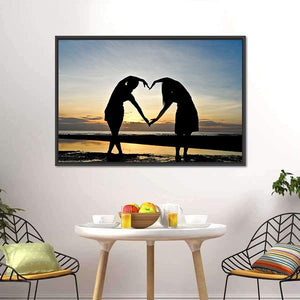 This beautiful canvas art features two figures at the beach, their silhouettes forming a heart shape against a serene sunset. With a palette of blue, orange, yellow, and black, it brings a romantic touch to any space.