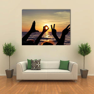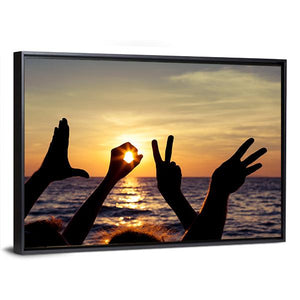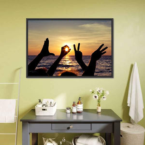 This artwork features beautiful silhouettes of hands making peace signs, framing a stunning sunset over the ocean. The warm palette of orange and yellow evokes a peaceful and hopeful atmosphere, making it a perfect addition to your wall decor.