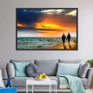 A realistic landscape showing a couple walking on the beach at sunset, their silhouettes holding hands beneath a dramatic orange and blue sky. The peaceful, romantic mood and warm coastal palette suit modern living rooms, bedrooms, or beach-inspired spaces.