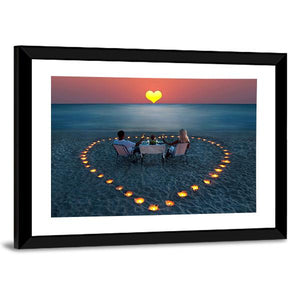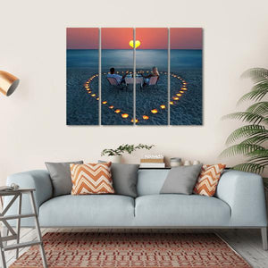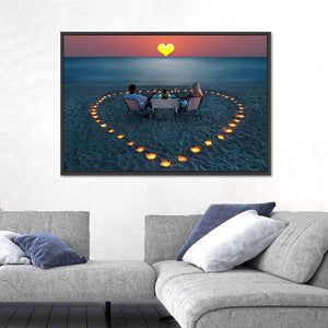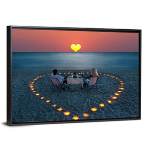 This canvas art captures a romantic scene of a couple enjoying dinner on a serene sandy beach, surrounded by the warm glow of candles. The vibrant sunset hues of blue, orange, and yellow create an intimate atmosphere that makes it a lovely addition to your space.
