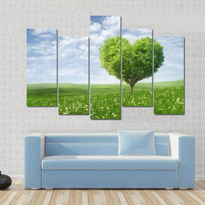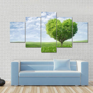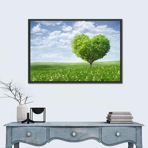 This canvas art features a heart-shaped tree under a cloudy sky, surrounded by rolling hills and a field dotted with white wildflowers. The serene and romantic scene evokes a sense of peace and connection to nature.