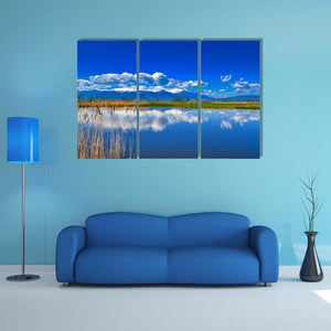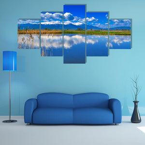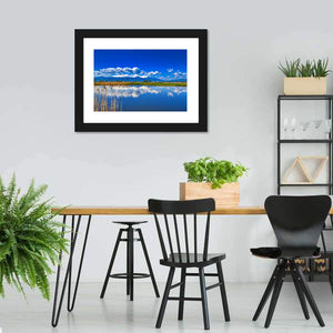 This captivating landscape art features a serene lake reflecting snow-capped mountains under a beautiful sky. With its calming blue and green palette, it brings a touch of nature's tranquility to any space.