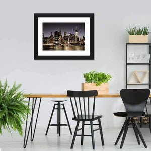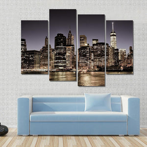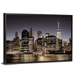 This canvas features a stunning view of the Manhattan skyline at night, showcasing illuminated skyscrapers and a tranquil waterfront. The deep blue and golden hues create a captivating urban atmosphere.