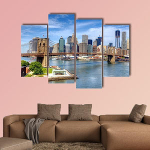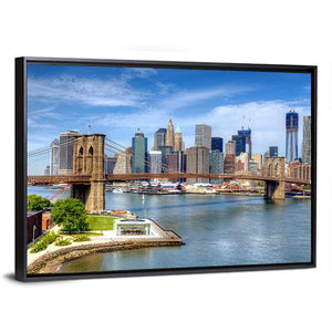 A realistic mid-shot of the Brooklyn Bridge with the Lower Manhattan skyline across the East River. Cool blues, greys and soft greens give the scene an urban, daytime calm that suits modern living rooms or city offices.