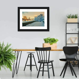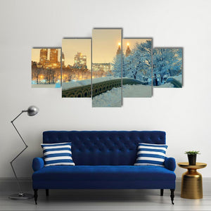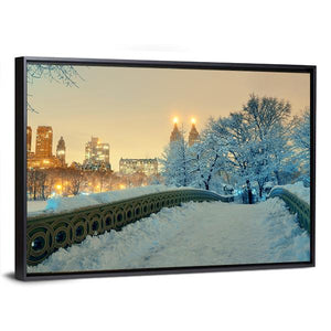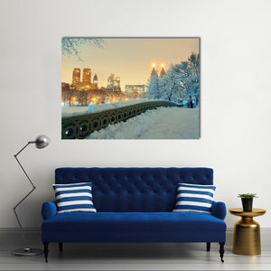 This canvas art features a snowy bridge against a serene winter skyline. The peaceful scene, with ornate details and a soft color palette of blue and white, brings the charm of New York into your space.