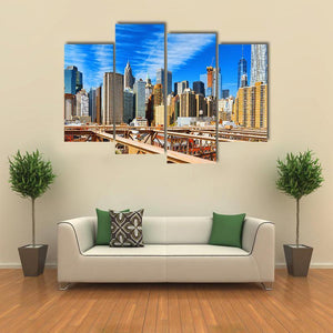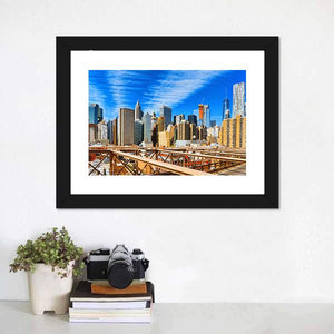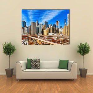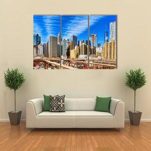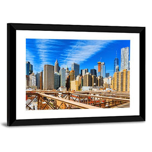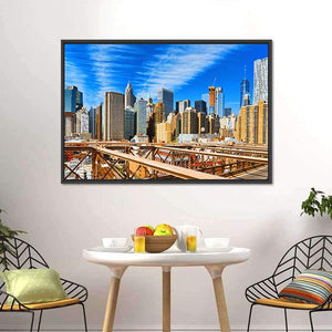 This photorealistic canvas shows Manhattan’s skyline with the Brooklyn Bridge in the foreground, captured in a wide, eye-level daytime shot. Blue, brown, grey and white tones, a partially constructed skyscraper and wispy clouds give it an urban, grand, sunny feel that works well in modern or urban interiors.