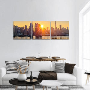 This panoramic canvas captures the Manhattan cityscape at sunset, with warm orange and yellow hues, a sunburst over the skyline, and soft reflections on the water. The scene reads as serene yet vibrant, bringing a modern, majestic feel that suits contemporary living rooms, offices, or entryways.
