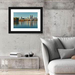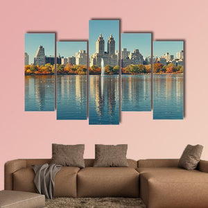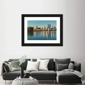 A realistic landscape of Manhattan skyscrapers rising above a calm lake, with a dancing fountain and trees showing fall foliage. Daylight and still water reflections create a peaceful, urban, autumnal atmosphere. Suits living rooms or modern offices that favor serene city scenes.