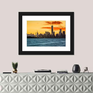 A photorealistic view of the New York City skyline featuring the Statue of Liberty facing One World Trade Center across the water. Warm orange and cool blue tones with gray and white create a vibrant yet serene sunset cityscape. Suited to modern, Manhattan-inspired home decor and urban interiors.