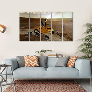 This captivating artwork features a six-wheeled Mars rover exploring a desolate Martian landscape. With its photorealistic style, it captures the rocky terrain and a sky filled with textured clouds, creating an atmosphere that feels both exploratory and sci-fi.