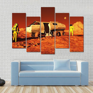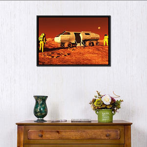 This canvas art features an astronaut exploring a desolate alien landscape with a six-wheeled rover. The vibrant palette of orange, red, and yellow evokes a futuristic and exploratory mood.