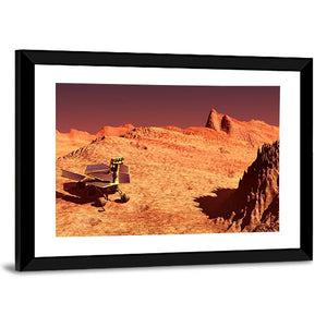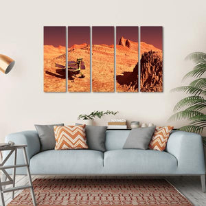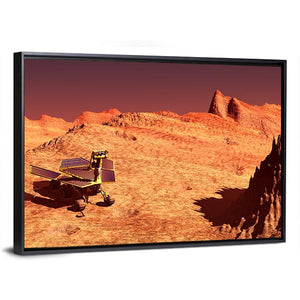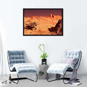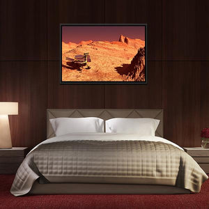 Explore the alien Martian landscape with this striking canvas art featuring a Mars rover. The low-angle view highlights the rugged rock formations and solar panels, creating an atmosphere of desolation and discovery.