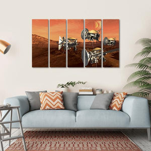 Explore a captivating alien landscape with our Spacecraft Probes On Mars canvas art. Featuring multiple spacecraft navigating the dusty Martian terrain against a backdrop of orange and gold hues, this artwork evokes a sense of adventure and awe, making it a stunning addition to your décor.