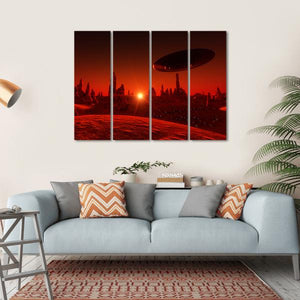 This canvas art features a dramatic sunset on an alien planet, complete with striking rock formations and a disc-shaped UFO hovering above. The rich reds and oranges against deep blacks and grays create a mysterious atmosphere, making it a captivating addition to any space-themed décor.