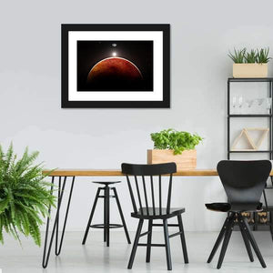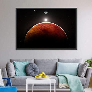 This canvas art captures the awe of outer space, featuring a realistic depiction of planet Mars alongside a detailed moon. With vibrant hues of red and orange against a cosmic backdrop, it brings a vast and breathtaking atmosphere to any room.
