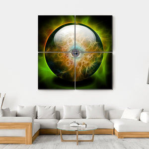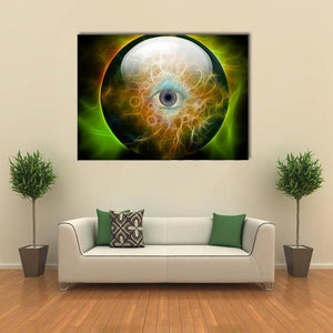 This abstract canvas art features an eye centered within a crystal orb, radiating ethereal light patterns. The intriguing blend of green, blue, and orange adds to its mysterious and surreal vibe.