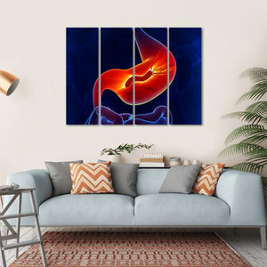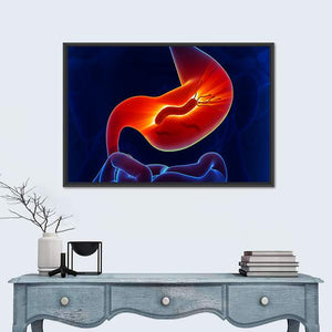 This captivating artwork offers a close-up look at the stomach and intestines, showcasing a detailed, microscopic view filled with swirling spiral-shaped bacteria and a glowing stomach lining. Its intriguing scientific theme makes it a unique addition to any medical or science-inspired decor.