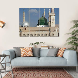This canvas features the grand mosque of Masjid-E-Nabawi, showcasing its stunning green and silver domes alongside tall minarets. With its serene atmosphere and photorealistic detail, it beautifully captures the essence of this significant Islamic landmark.