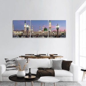 A photorealistic panoramic canvas of a mosque at dusk, showing domes, minarets, lamps and people in a blue, pink, green, white and gold palette. The scene reads serene and spiritual, with a grand, calm mood that suits modern living rooms, entryways or quiet prayer spaces.