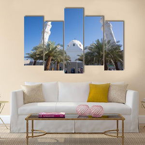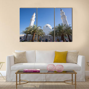 This photorealistic canvas art features the serene Quba Mosque surrounded by palm trees and people. The bright blue sky enhances the spiritual atmosphere, making it a beautiful addition to your wall decor.