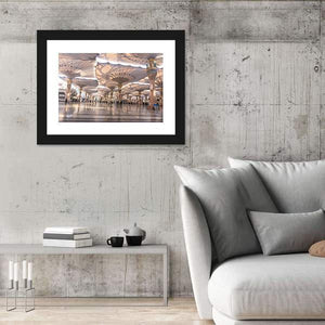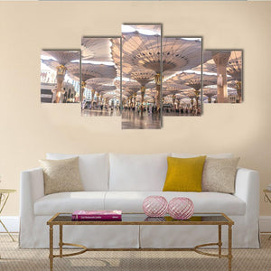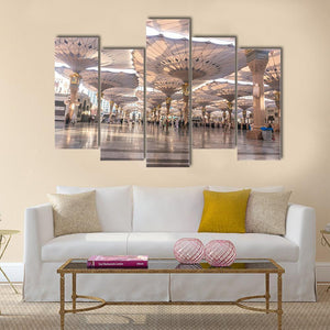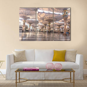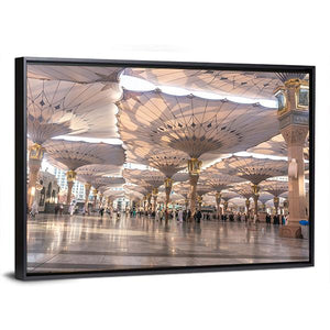 This canvas wall art captures the serene exterior of the Nabawi Mosque in Medinah, featuring a wide-angle view of elegant umbrellas providing shade over the courtyard. The peaceful atmosphere and grand architecture make it a perfect fit for modern decor.