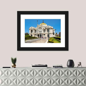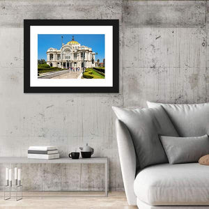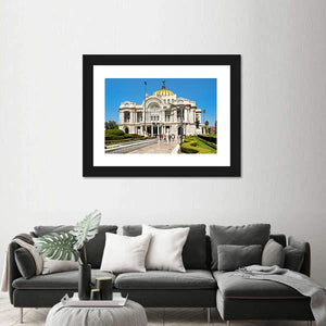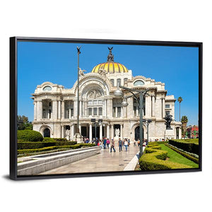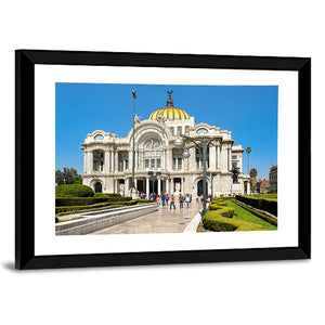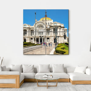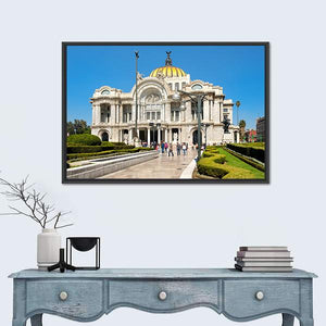 This canvas art depicts the grand architecture of the Palacio de Bellas Artes in Mexico, highlighting its golden dome and ornate facade. The lush garden and manicured hedges create a sunny, stately atmosphere that brings elegance to any space.