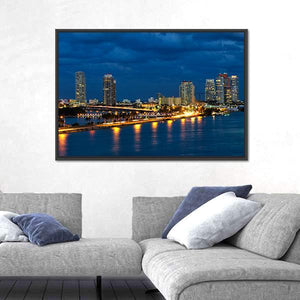 Night In Miami Florida Canvas Wall Art depicts the Miami city skyline and bridge under a moody night sky, with buildings lit up and reflections on the water. The blue palette, with touches of yellow and white, creates a calm, urban nighttime atmosphere that suits modern living rooms or home offices.