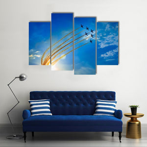 This canvas art features dynamic airplanes soaring through a vibrant blue sky, leaving smoke trails in their wake. Its awe-inspiring composition captures the energy of airshows, making it a striking addition to any modern space.