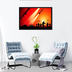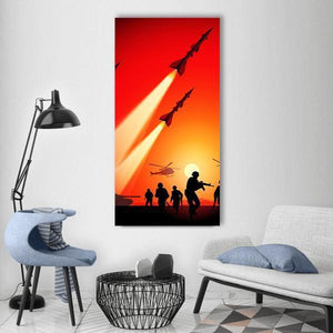 This canvas portrays military action with missiles, silhouetted soldiers and helicopters, set against bold reds, oranges, black and white. Composed using the rule of thirds in a modern, graphic style, it delivers an intense, action-packed and dramatic atmosphere. Suited to modern or industrial rooms and military-themed decor.