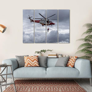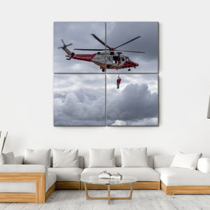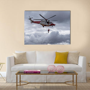 This powerful canvas art depicts a coastguard helicopter in action, capturing a dramatic rescue scene with a swimmer suspended from the cable against stormy clouds. The striking palette of gray, white, red, and blue adds urgency to any space.