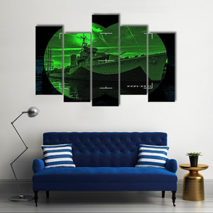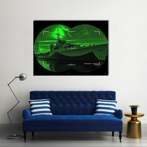 A military ship seen through a binoculars-style view, rendered in night-vision greens, black and white. Graphic and modern, the image includes crosshairs, coordinate data and cloud patterns for a technical, observational mood—suited to modern living rooms or home offices.