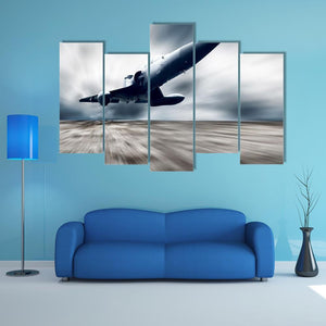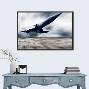 This canvas art captures a dynamic jet fighter taking off against a backdrop of dark stormy clouds. The motion blur effect conveys speed and action, making it a striking statement piece for any modern decor.