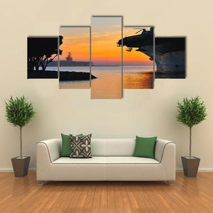 This striking canvas features an aircraft carrier against a serene sunset backdrop over the ocean. The calm, photorealistic scene is perfectly complemented by a palette of orange, blue, and grey, evoking a dramatic yet tranquil atmosphere.