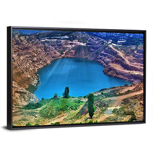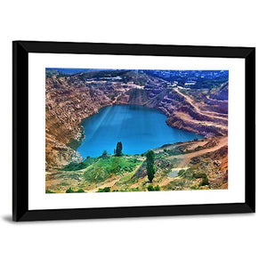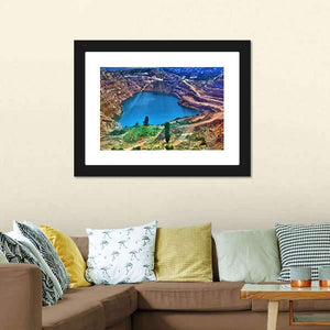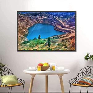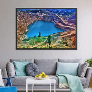 Aerial view of a quarry lake framed by rock formations and clusters of trees, with sunbeams radiating from the center of the water. Rendered in vibrant, realistic color—blues, browns, greens and touches of orange—this landscape creates a vast, serene and dramatic mood that suits modern home decor.