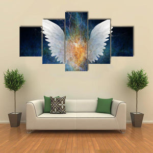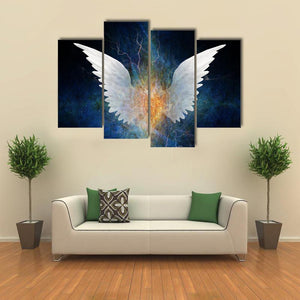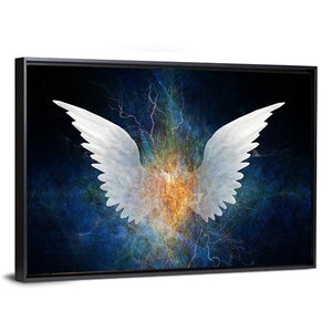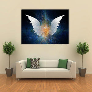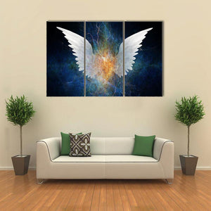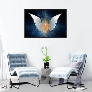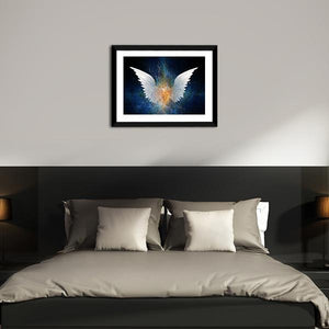 This powerful abstract piece features ethereal angel wings enveloped in dynamic, energetic light. Its striking palette of white, blue, orange, and yellow creates a vibrant focal point for any art lover's home.