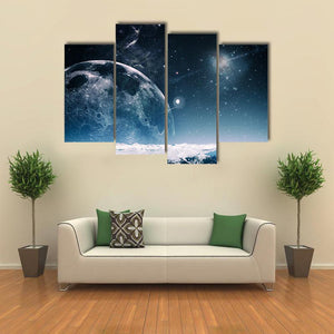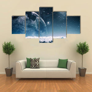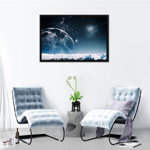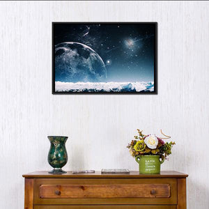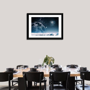 This canvas art features a breathtaking landscape of the moon and mountains set against a star-filled sky. With its epic and serene vibe, it adds a touch of modern fantasy to your décor.