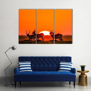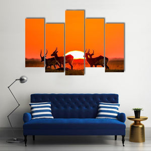 Antelopes are shown in silhouette against a large sun low on the horizon, rendered in a photorealistic, vibrant style with warm orange, yellow and brown savanna tones. The rule-of-thirds composition and serene, majestic mood make this print a calm focal piece for modern house room decor.
