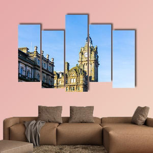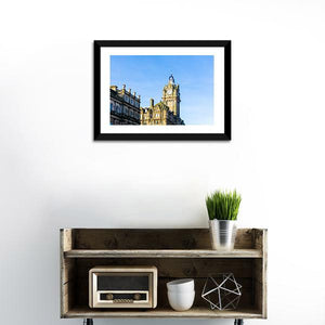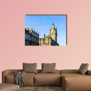 A photorealistic canvas of Edinburgh’s historic buildings and a clock tower, seen from a low angle. Sunlit blues, tans, greys and hints of green give a grand, historic mood; the domed roof and detailed facades make it a strong choice for room decor and modern interiors.