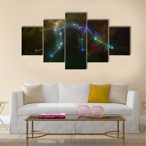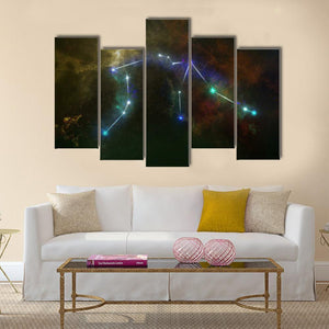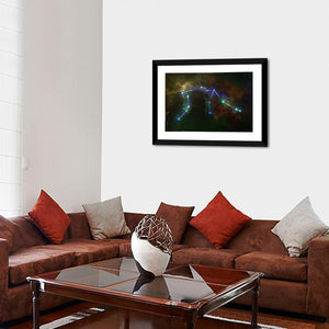 This modern, abstract canvas depicts the Aquarius constellation and stars set against a deep, nebula-like galaxy in blue, green, yellow, dark blue and purple. Glowing lines connect the stars and soft nebula clouds create a mysterious, ethereal, dreamy atmosphere that fits modern room decor like living rooms or bedrooms.
