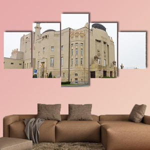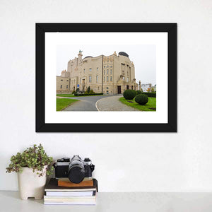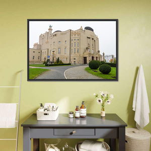 This canvas print depicts a grand, ornate state theater with a cobblestone road, statue, and surrounding bushes and lawn, presented in a realistic architectural style. Muted beige, green, grey and white tones give the scene a formal, imposing atmosphere. It suits entryways and formal living rooms where architectural presence anchors the space.