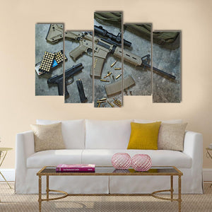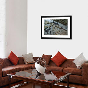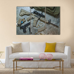 This intense canvas art features a detailed depiction of an assault rifle, pistol, and ammunition, all arranged in a flat lay composition. Its serious and tactical vibe makes it a striking addition to any space.