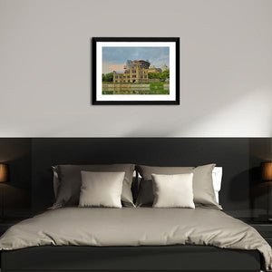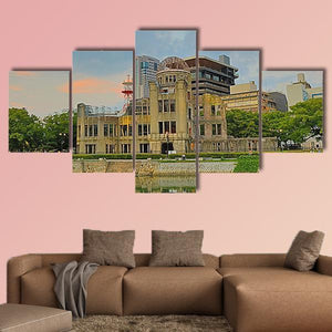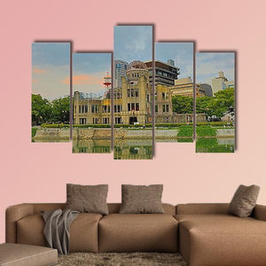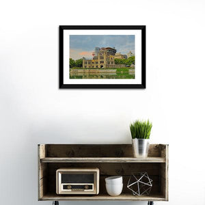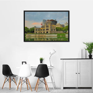 This canvas depicts the Atomic Bomb Dome by the river with modern buildings beyond, rendered in a realistic, somber and reflective style. Muted greys, blues, greens and tan give the scene a restrained, historical feel. It fits well as room decor for living rooms, studies, or offices that favor modern or historical themes.