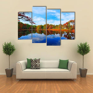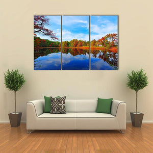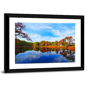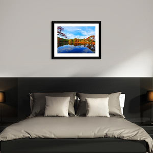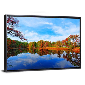 This canvas showcases the serene beauty of autumn, featuring vibrant reflections of trees in calm water under a blue sky. Its realistic style makes it a lovely addition to any nature-inspired decor.