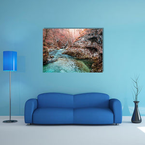 An autumn forest scene with a clear river, wooden walkway and rocky terrain in blue, green, brown and orange tones. The realistic composition uses depth and the rule of thirds to create a serene, peaceful mood. It fits nature-focused room decor and modern canvas art displays.