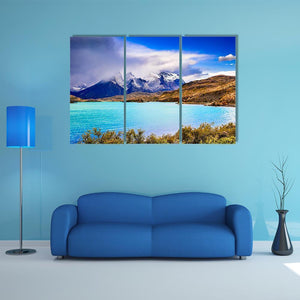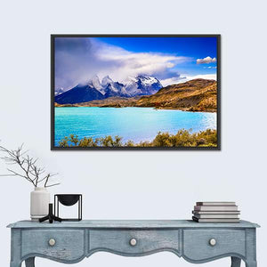 Torres Del Paine, Chile, appears here as a landscape of snow-capped mountains, turquoise water, and foreground foliage, evoking a serene yet dramatic feel. The image emphasizes depth and the rule of thirds, creating a majestic focal piece that suits modern, nature-inspired room decor.
