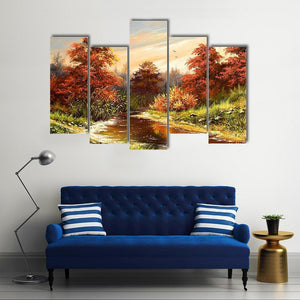 This Autumn Landscape With River shows a realistic river winding through a forest of autumn foliage, with reflections in the water, tall grasses, and birds in flight. Warm orange, red and brown tones with hints of green and blue create a peaceful, serene mood that suits modern or nature-inspired rooms.